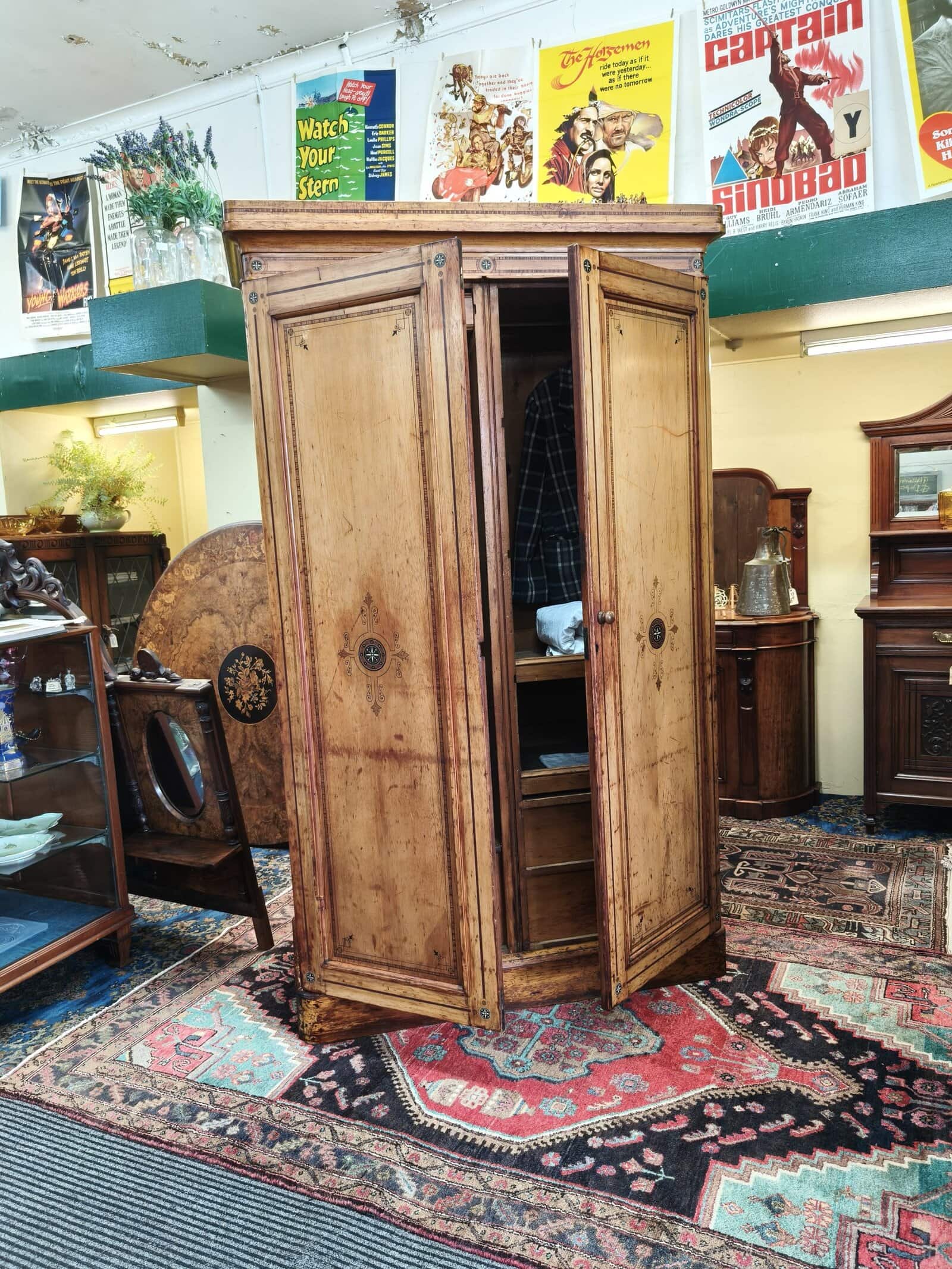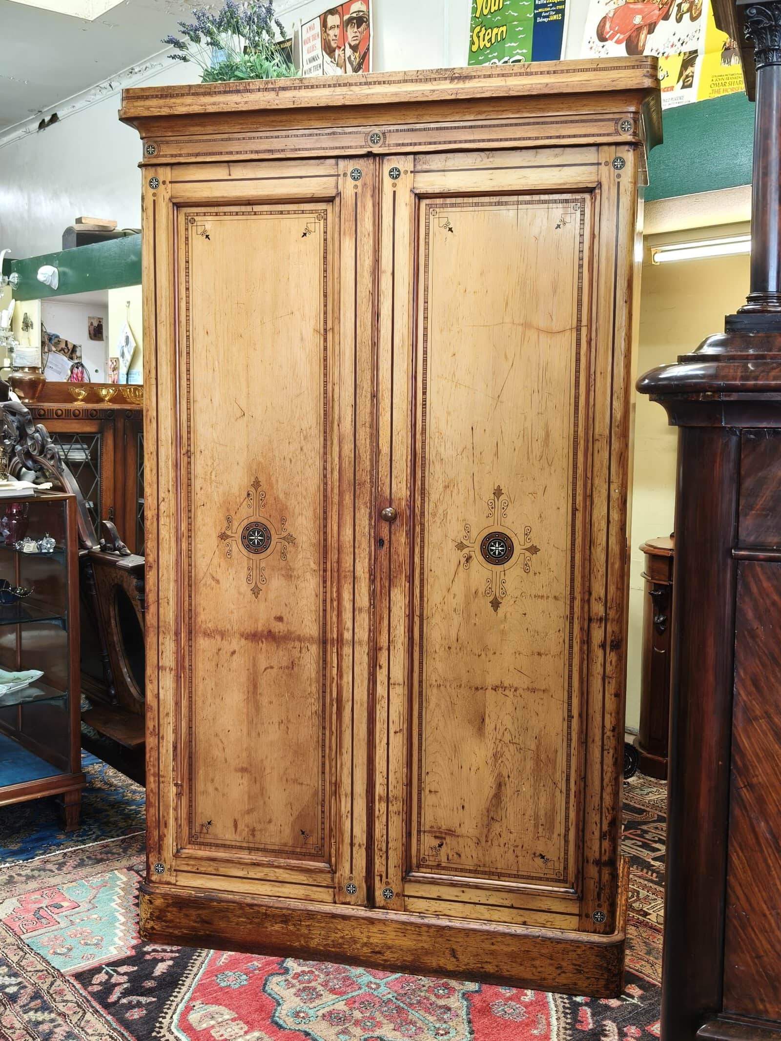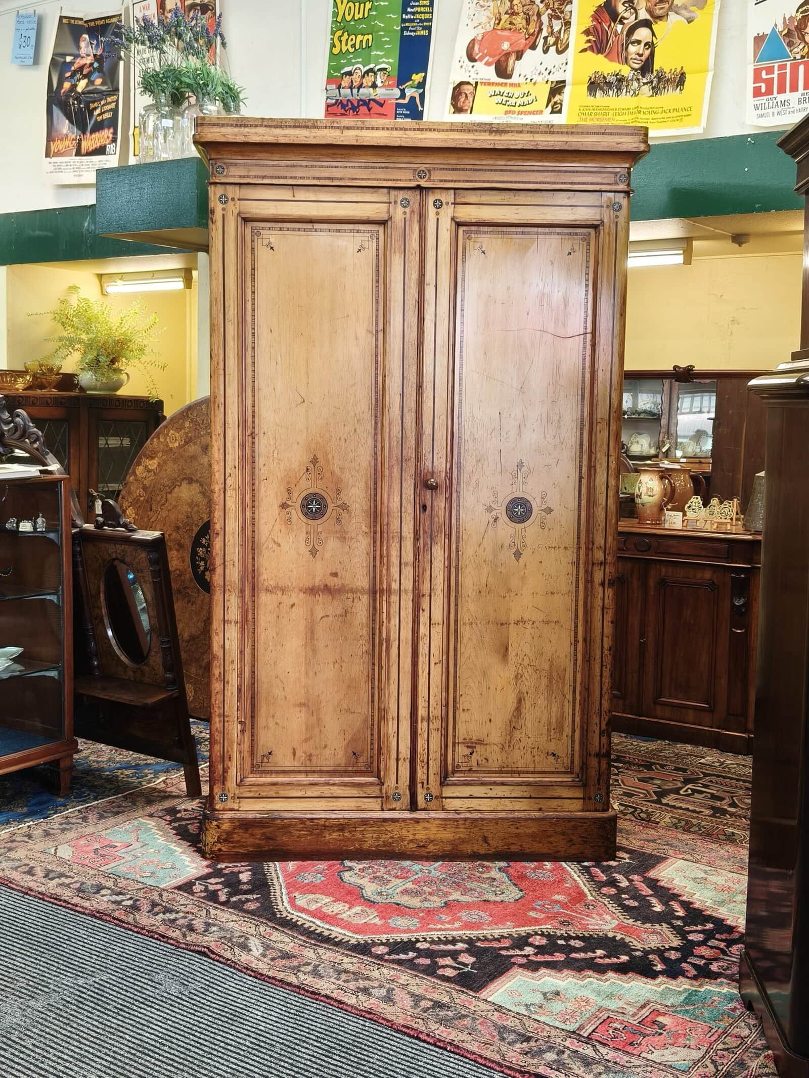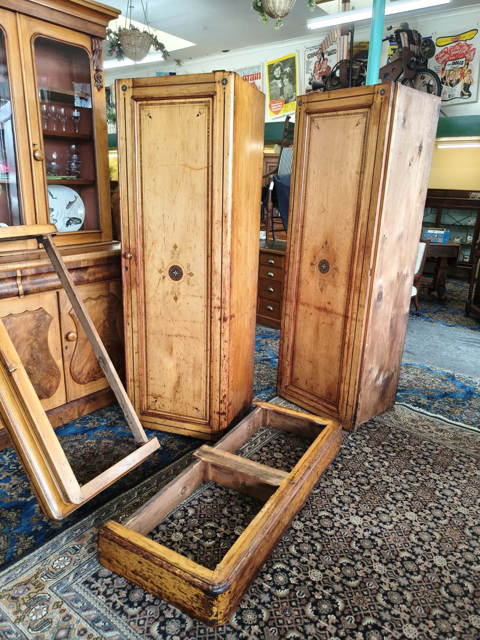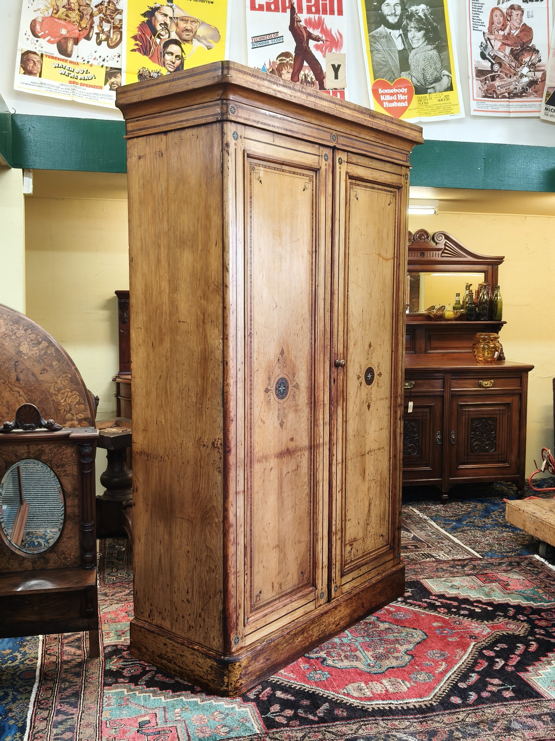 Check out this divine folk-painted, pine two bay wardrobe. She is inlaid, stenciled and has finely painted, Nordic style flower decals. Interior has a long hanging compartment one side, then the other hlower campaign drawers and sliders... Plenty of room for clothes, and got a darling country earthy feel. Generous patina but clean. Luckily, this beauty comes apart for transportation. Circa 1875.