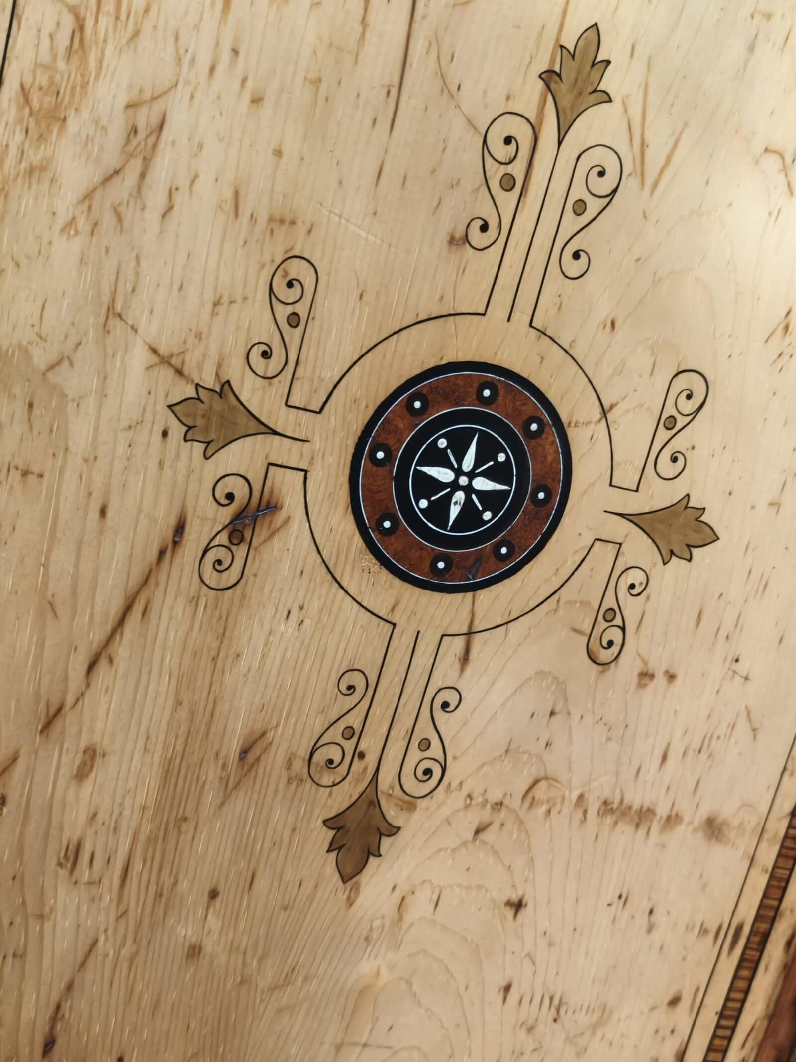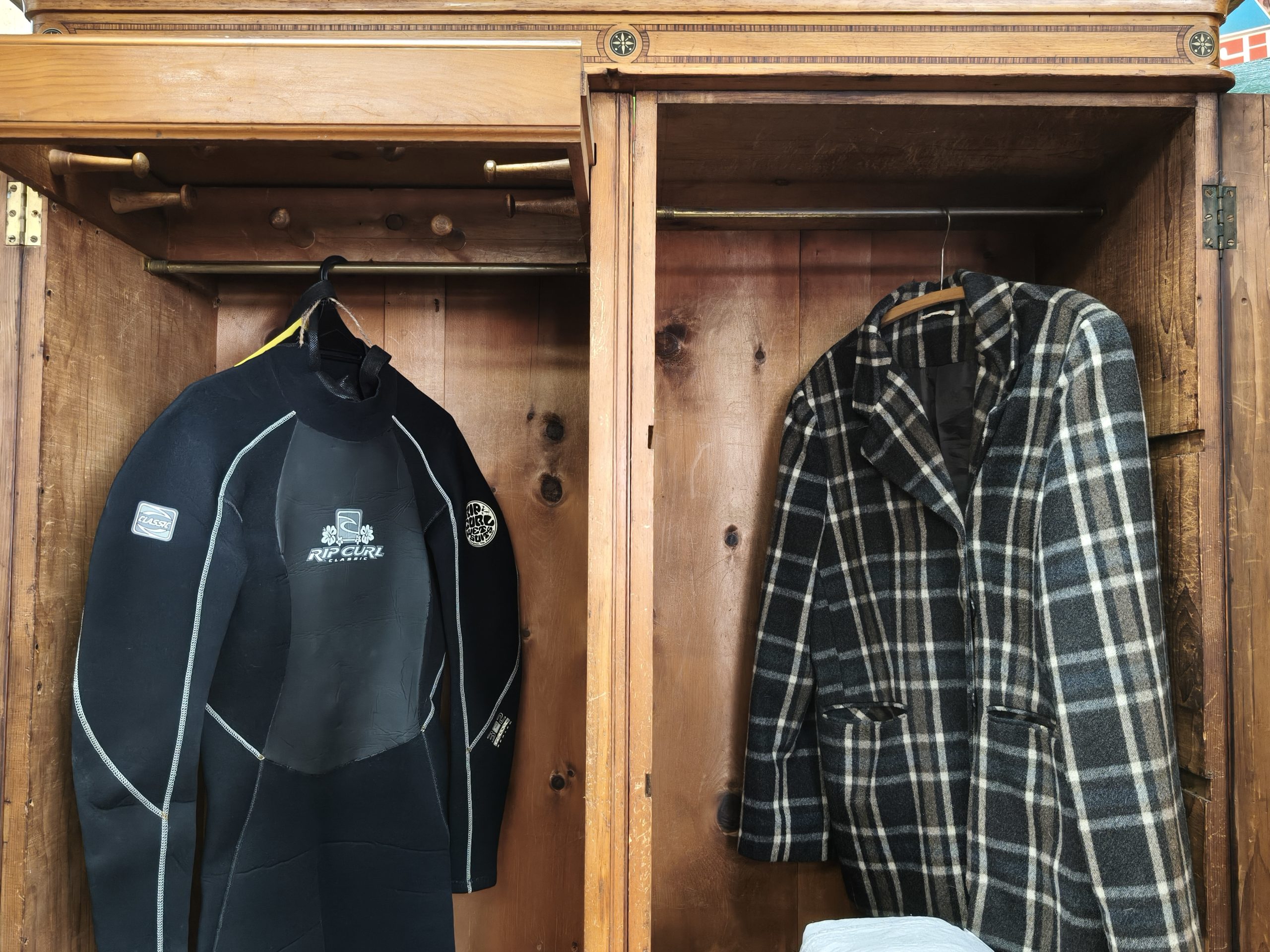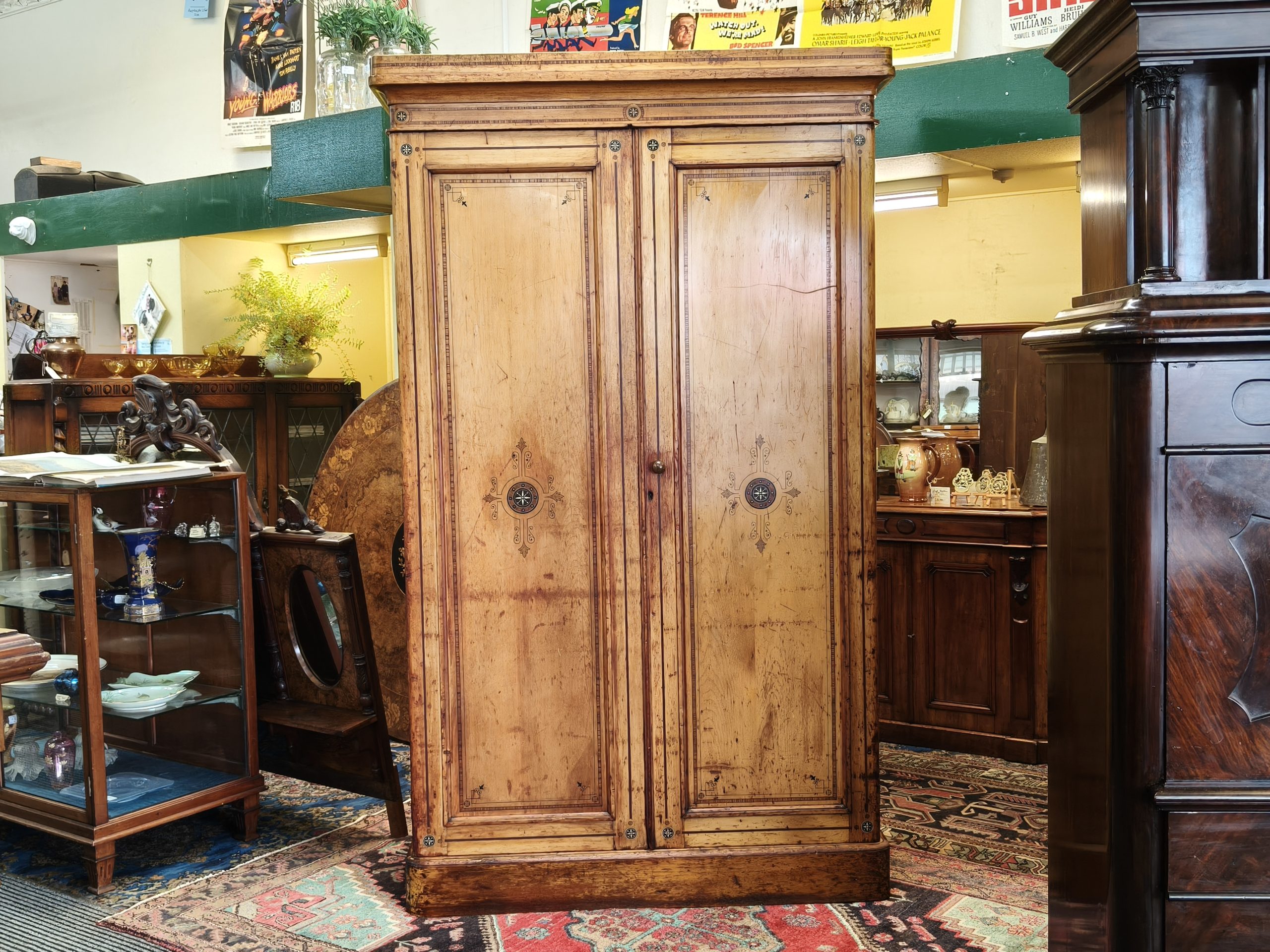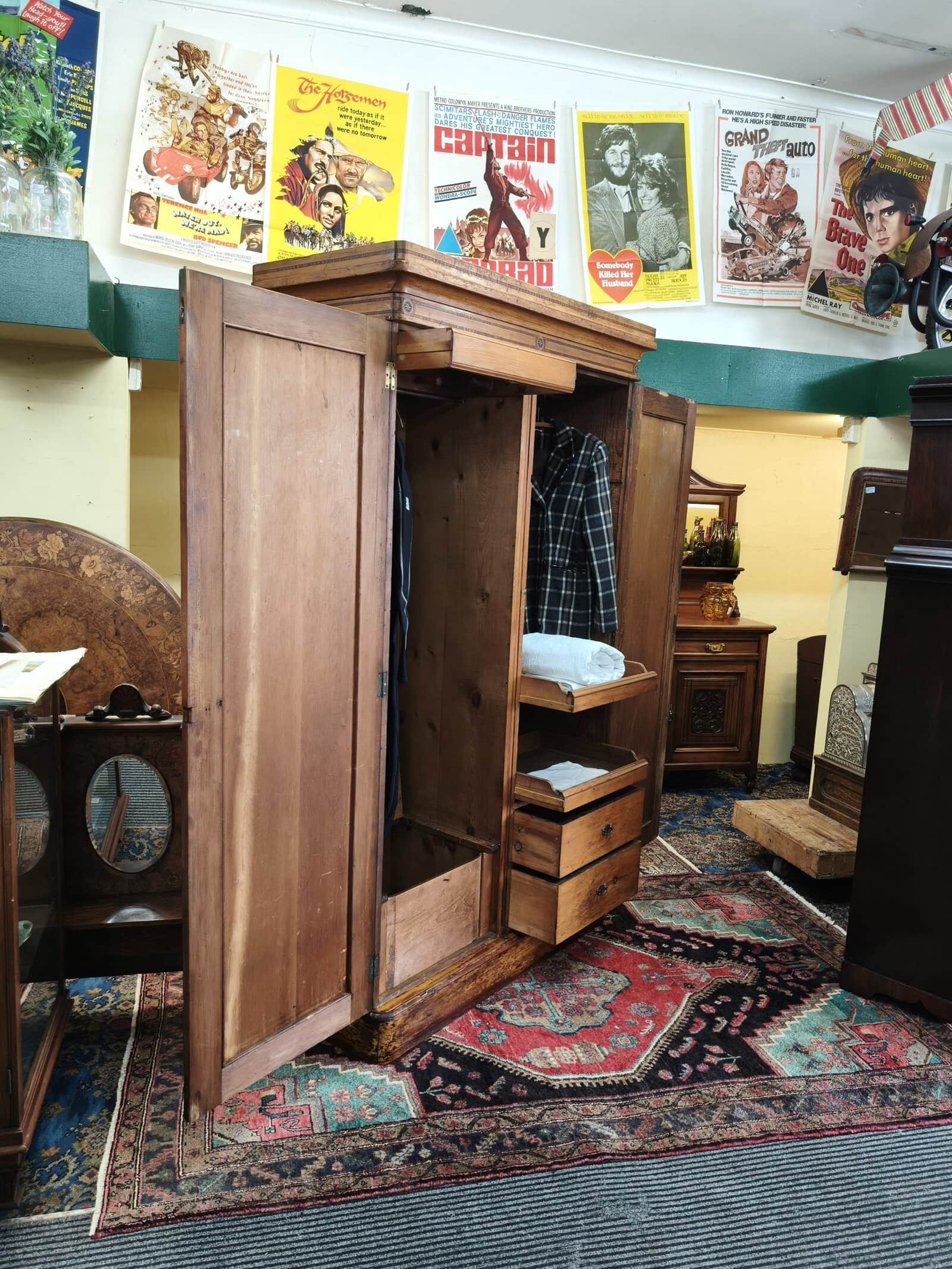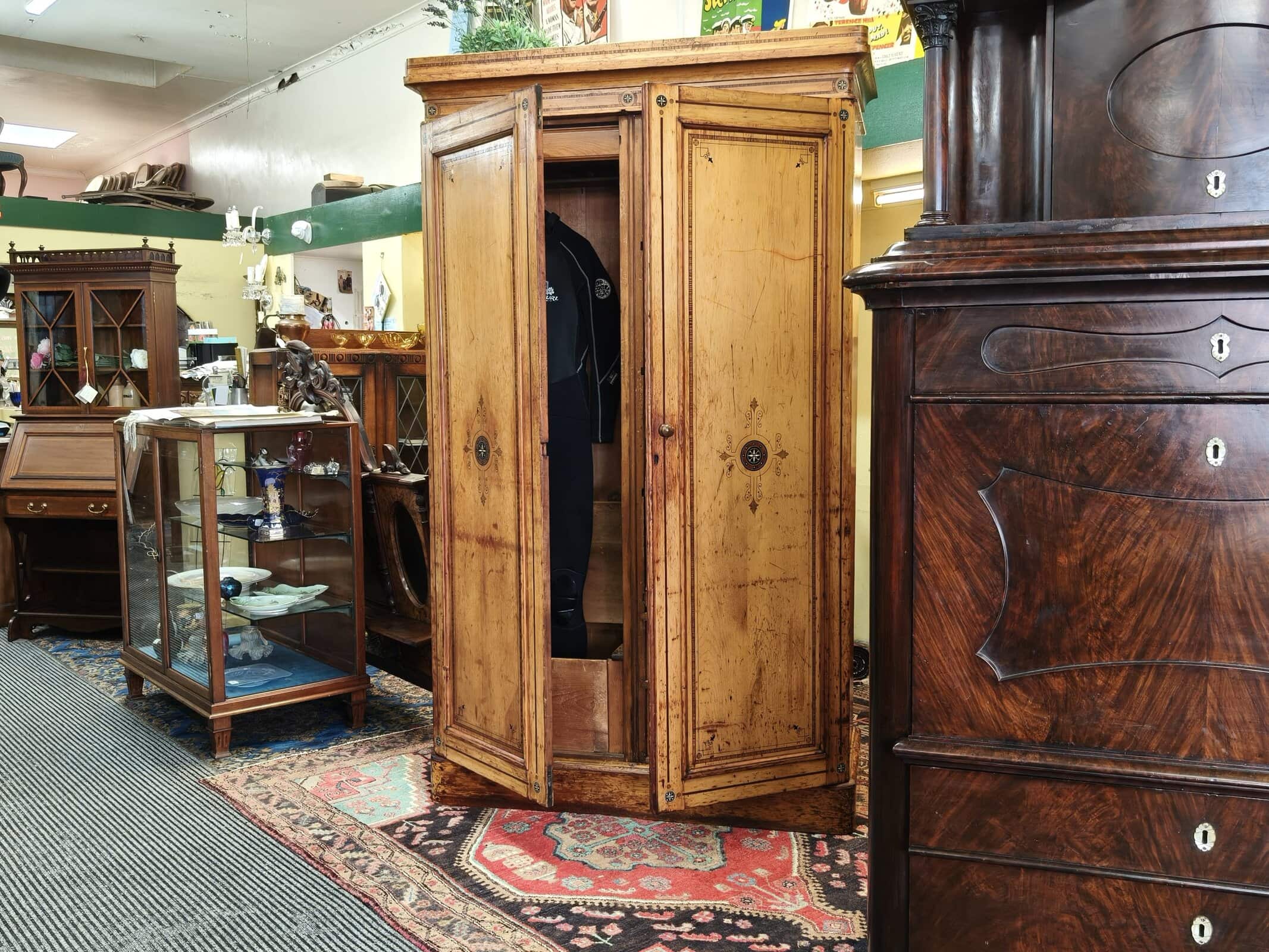 Check out this divine folk-painted, pine two bay wardrobe. She is inlaid, stenciled and has finely painted, Nordic style flower decals. Interior has a long hanging compartment one side, then the other hlower campaign drawers and sliders... Plenty of room for clothes, and got a darling country earthy feel. Generous patina but clean. Luckily, this beauty comes apart for transportation. Circa 1875.