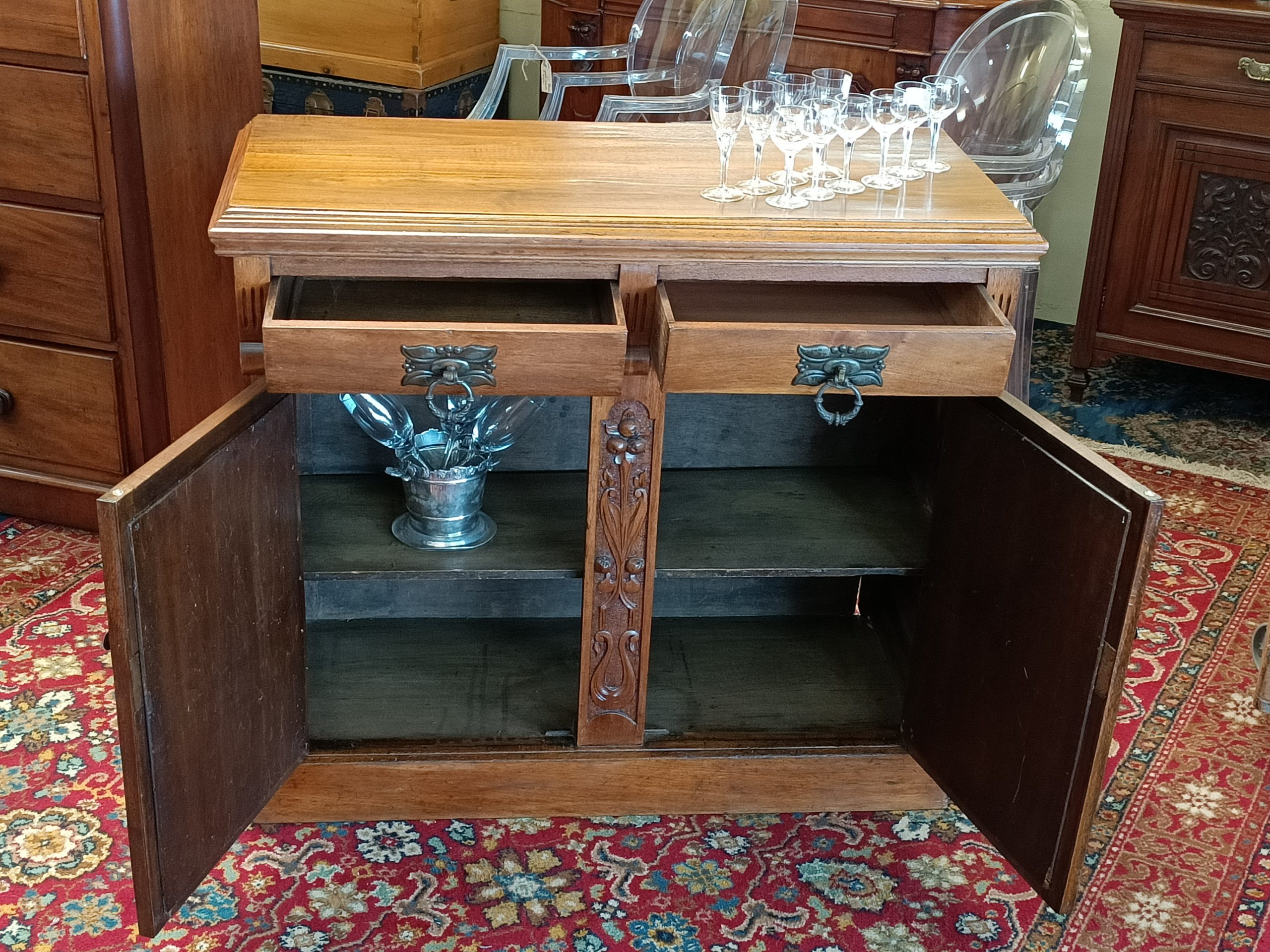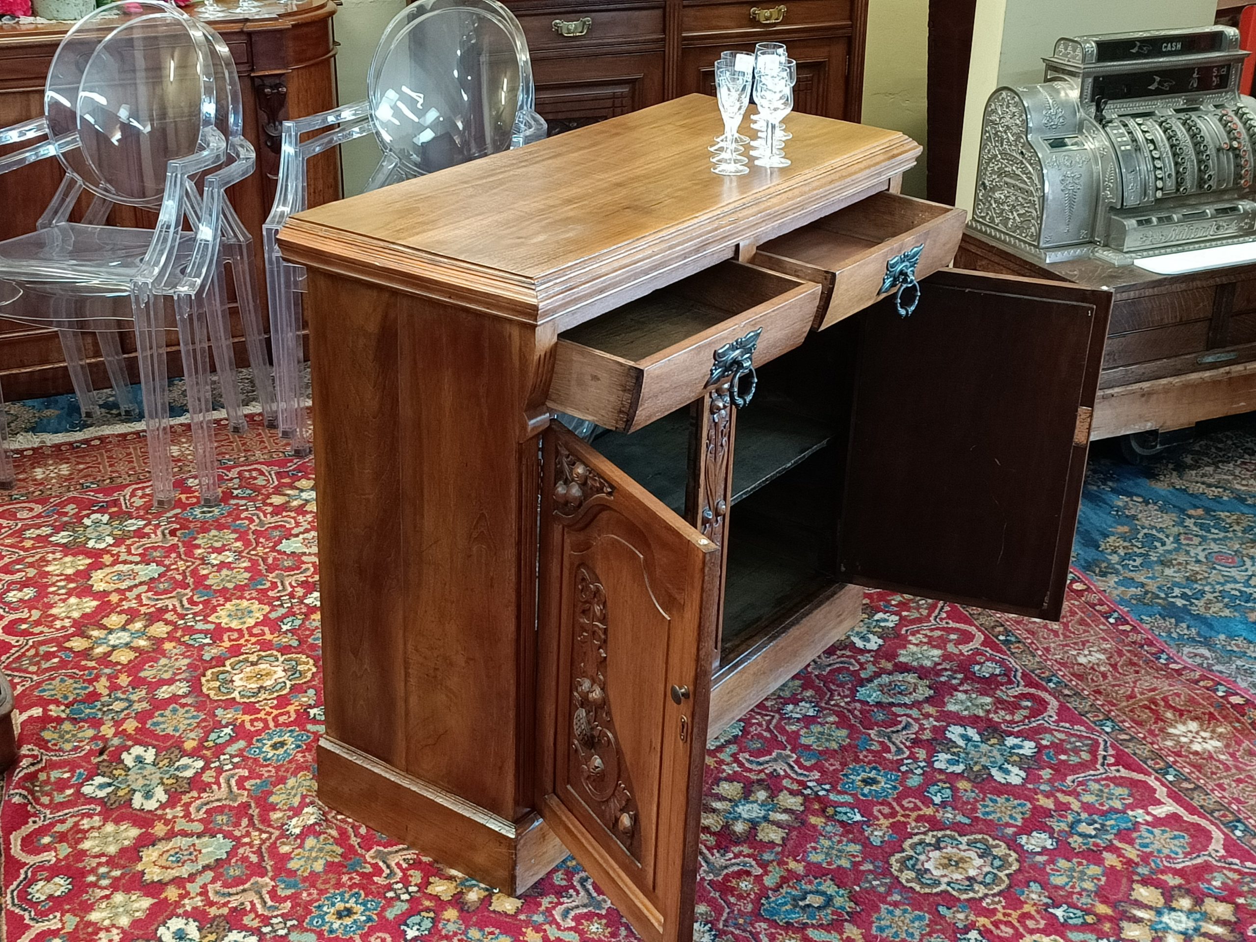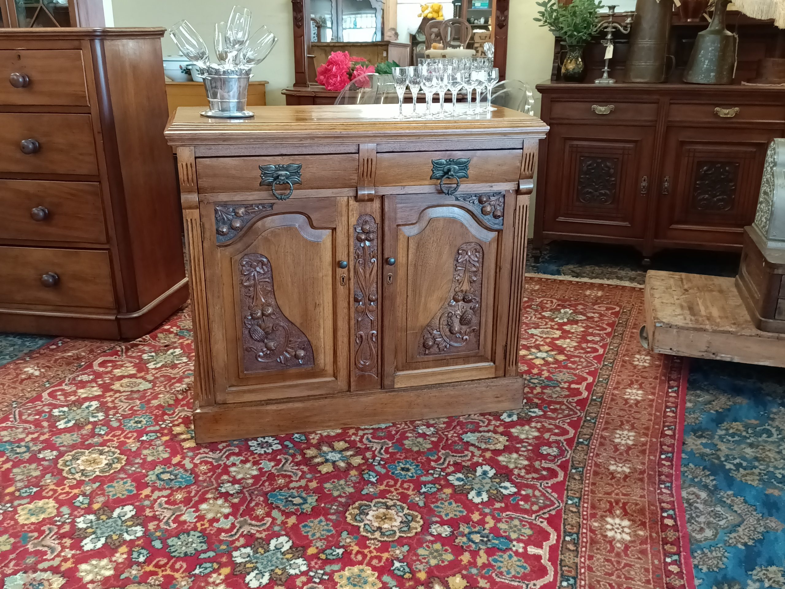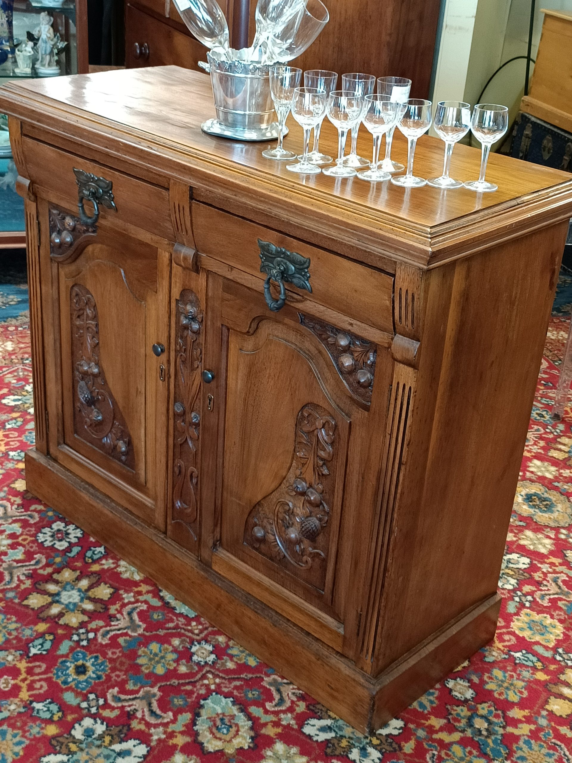 Need a little storage, and love the old stuff?  Perhaps, this sweetie of a two drawer two cupboard cabinet could tick your boxes.  Roasted nutty hue, fat handles, with pretty Nouveau carved door reliefs and curved drawer façades is her outside attire. Whilst inside... she is all space; great for plates, books, linen, toy room stuff, a shoe-house, extra kitchen storage, or even park the tv on her.  Plinth base.  Pretty good condition, a wee hole on back (towards the wall), and a little age-related small dishings' on top (full wine glass will sit just fine 🤭).   Circa 1895.