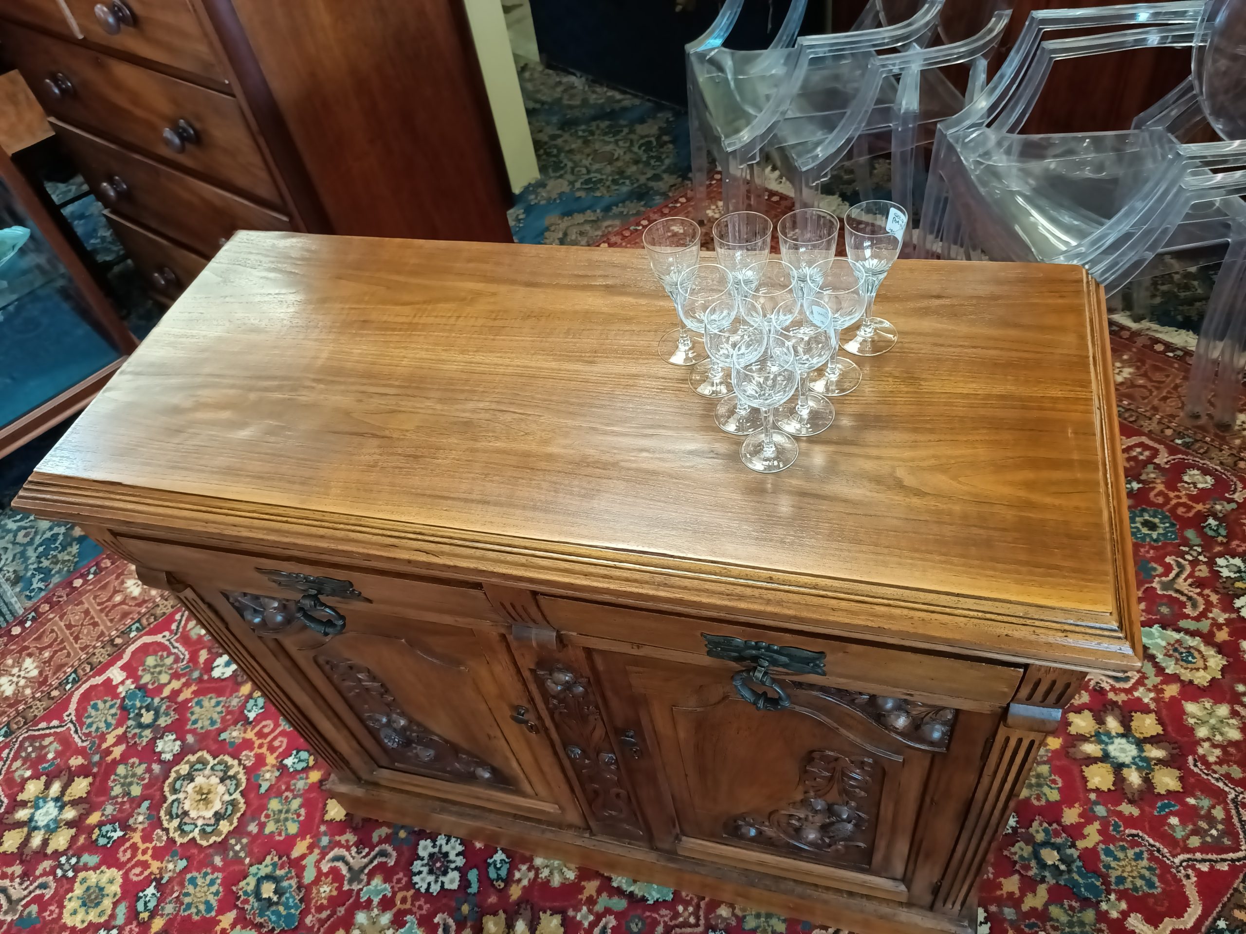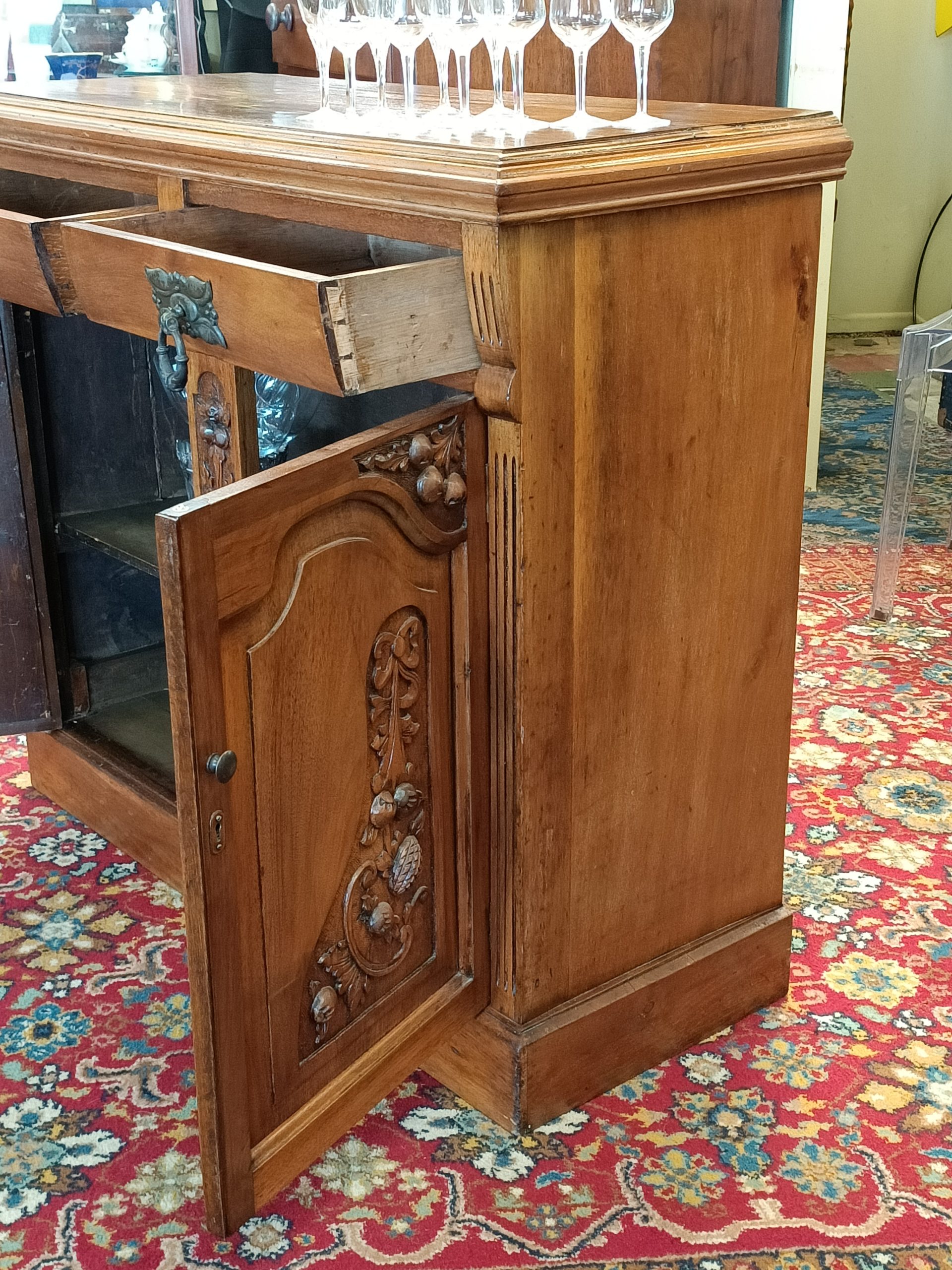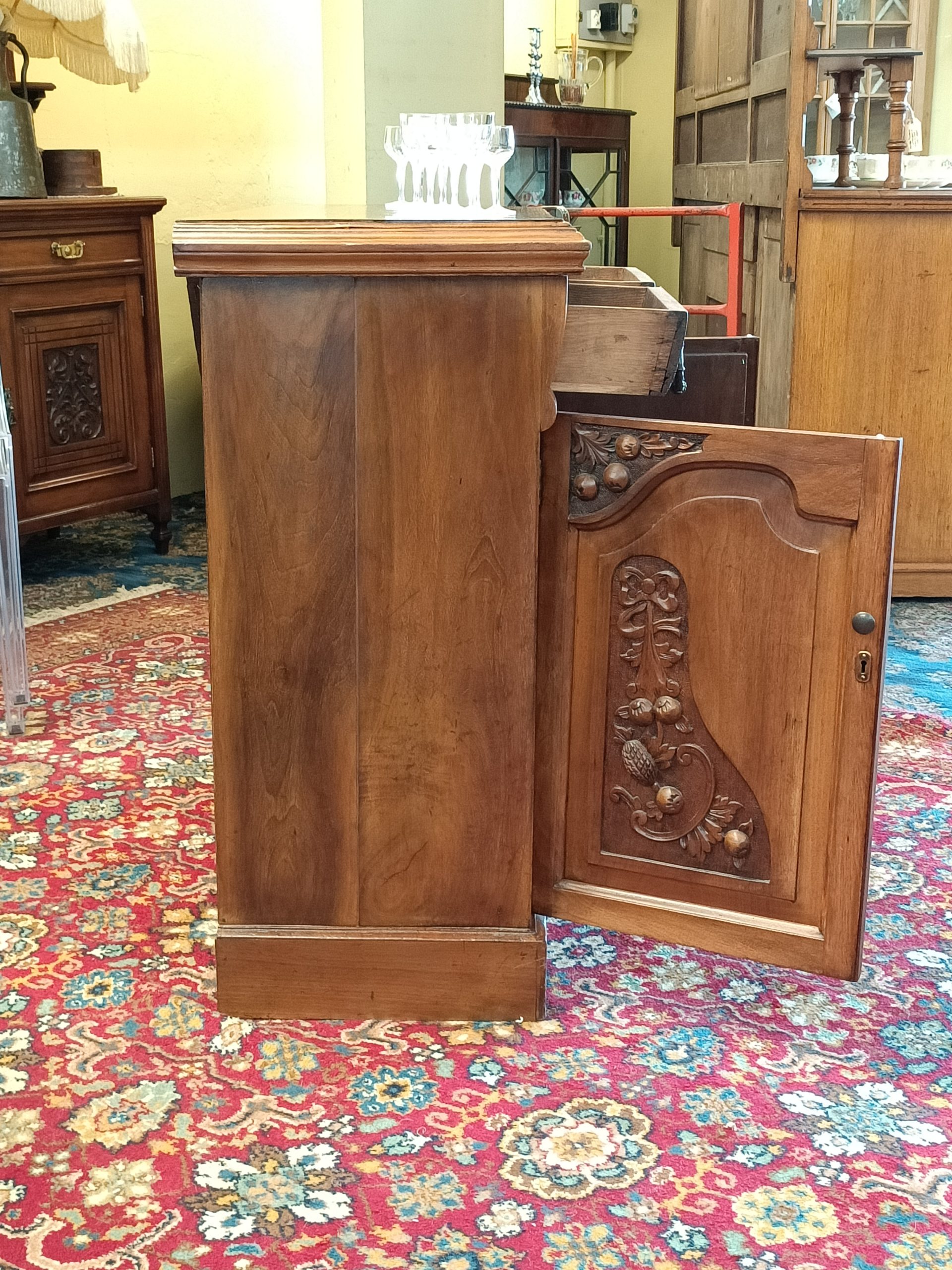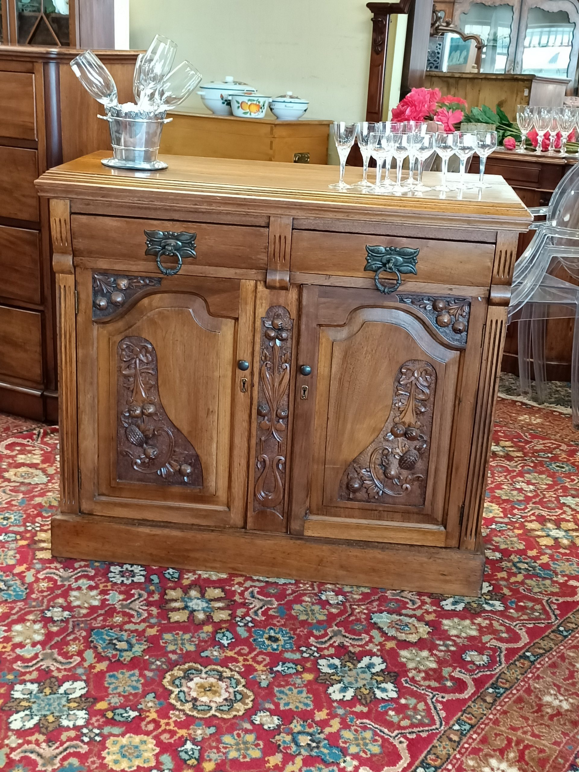 Need a little storage, and love the old stuff?  Perhaps, this sweetie of a two drawer two cupboard cabinet could tick your boxes.  Roasted nutty hue, fat handles, with pretty Nouveau carved door reliefs and curved drawer façades is her outside attire. Whilst inside... she is all space; great for plates, books, linen, toy room stuff, a shoe-house, extra kitchen storage, or even park the tv on her.  Plinth base.  Pretty good condition, a wee hole on back (towards the wall), and a little age-related small dishings' on top (full wine glass will sit just fine 🤭).   Circa 1895.