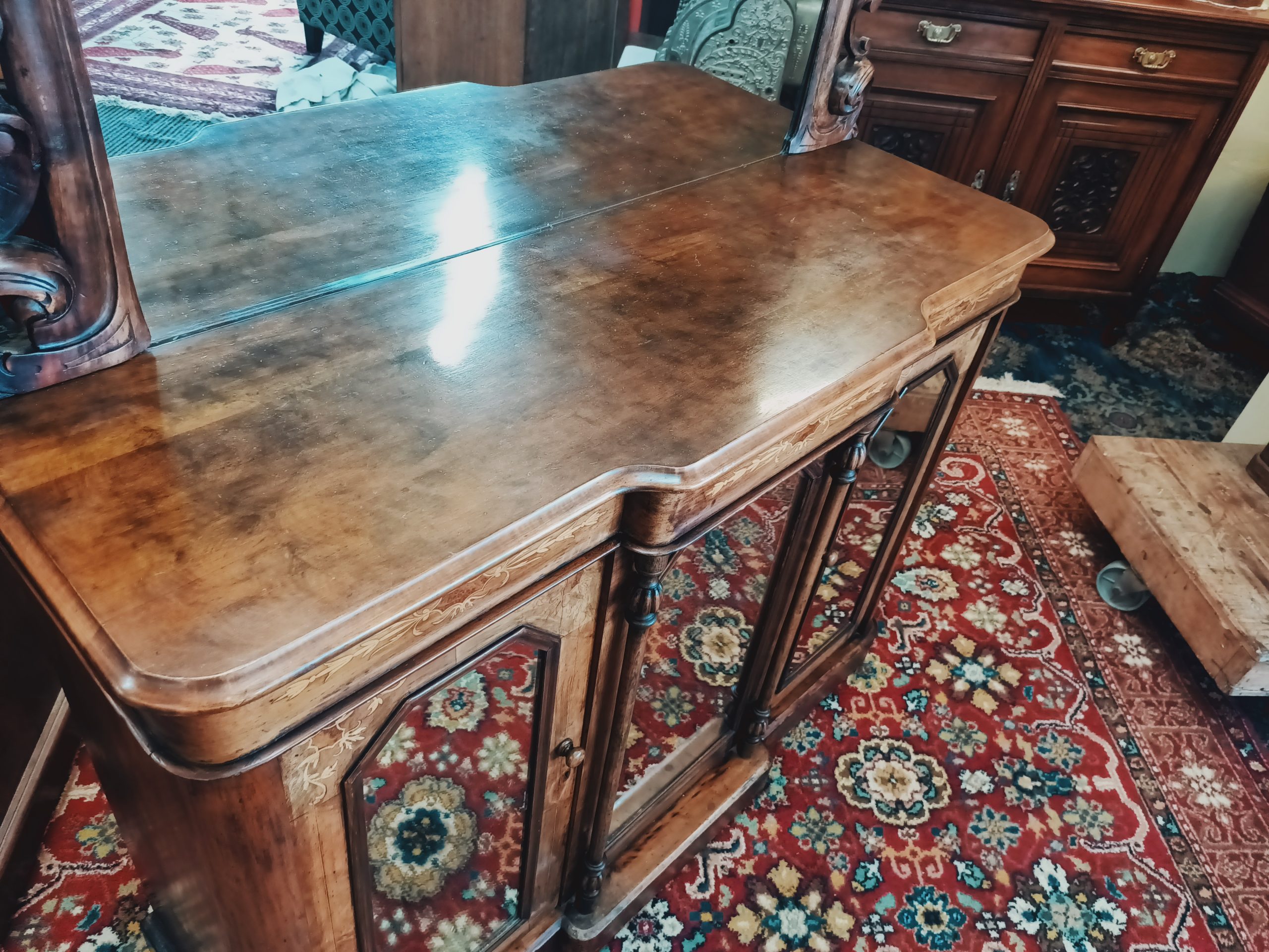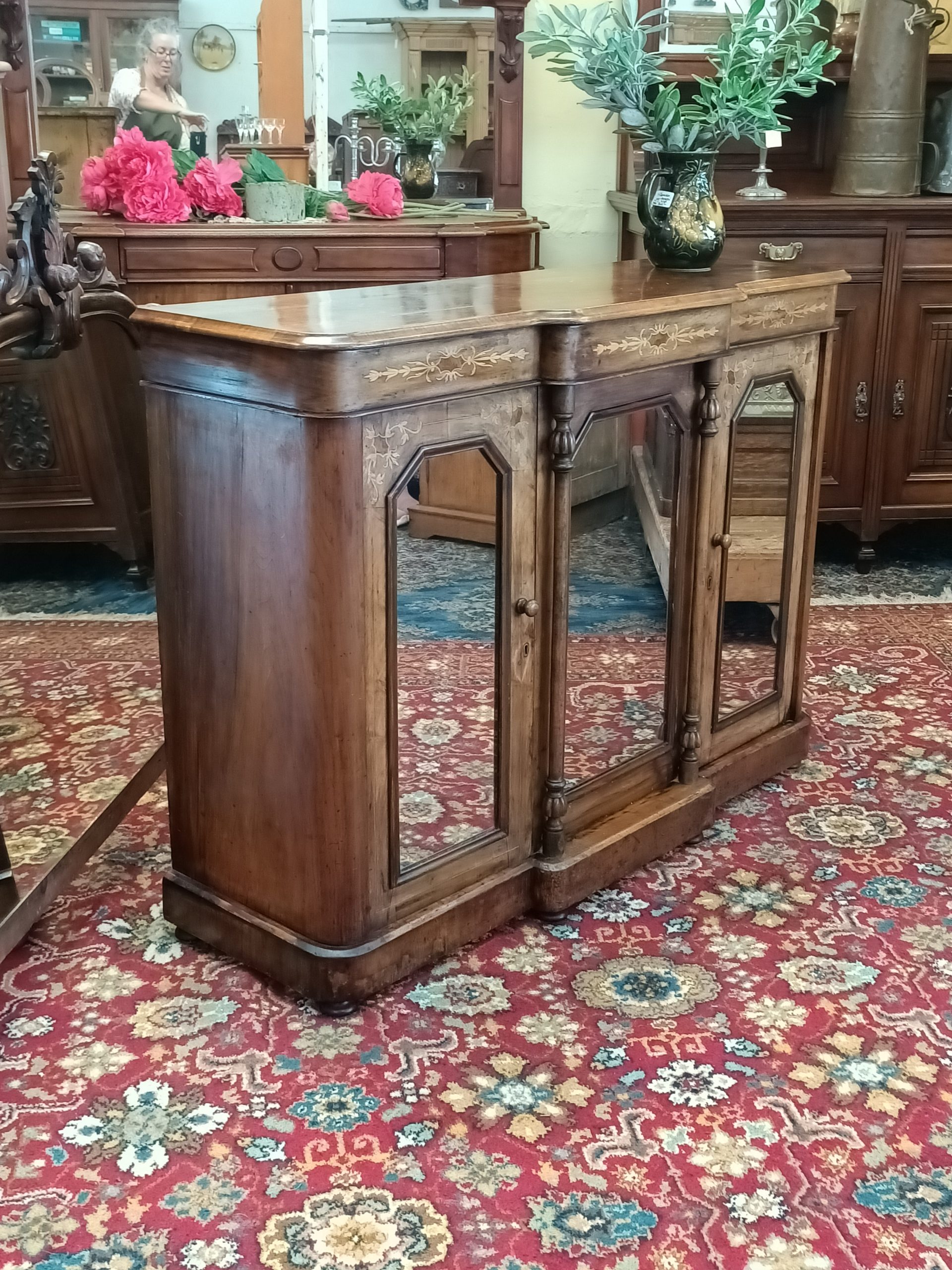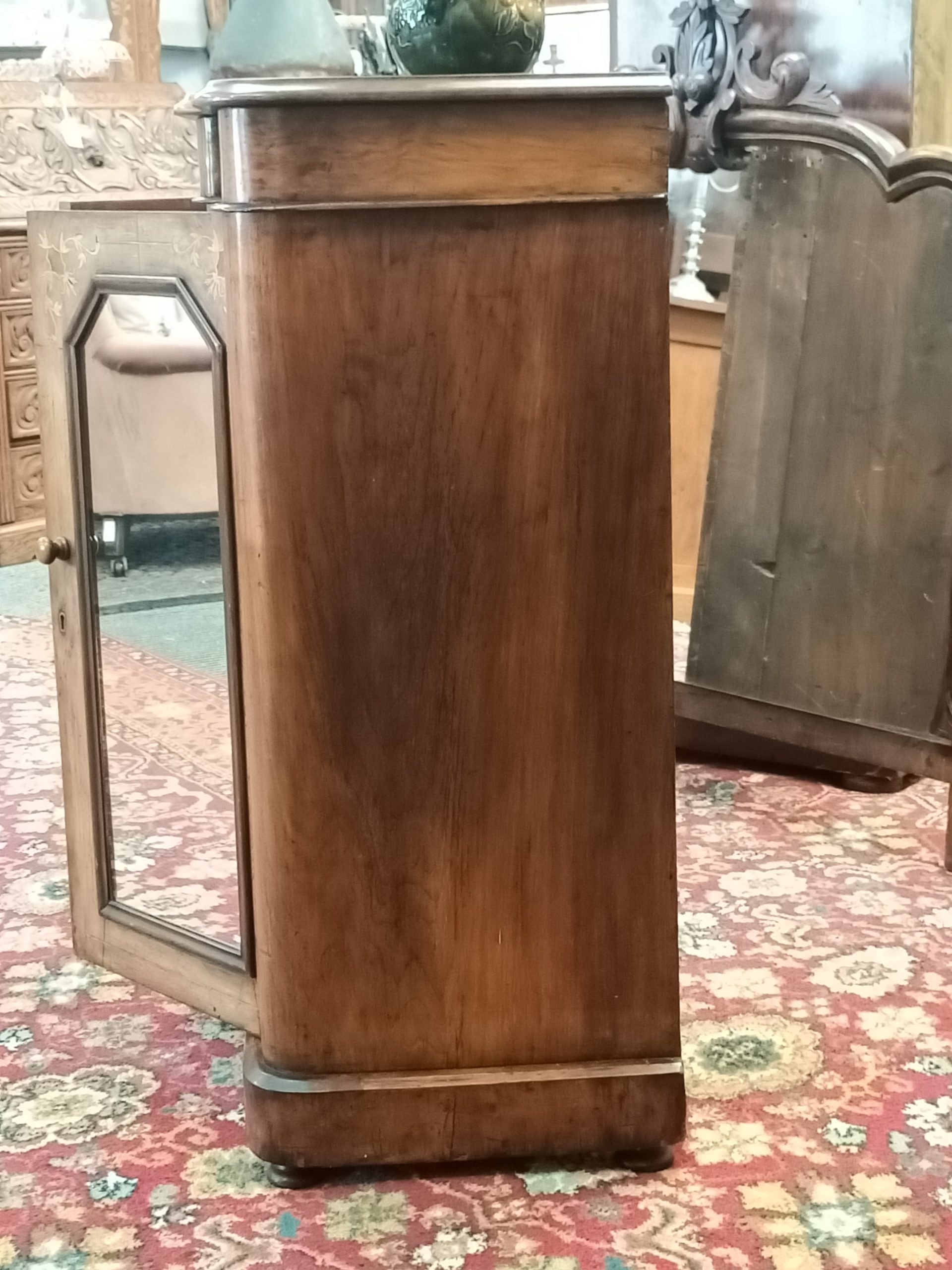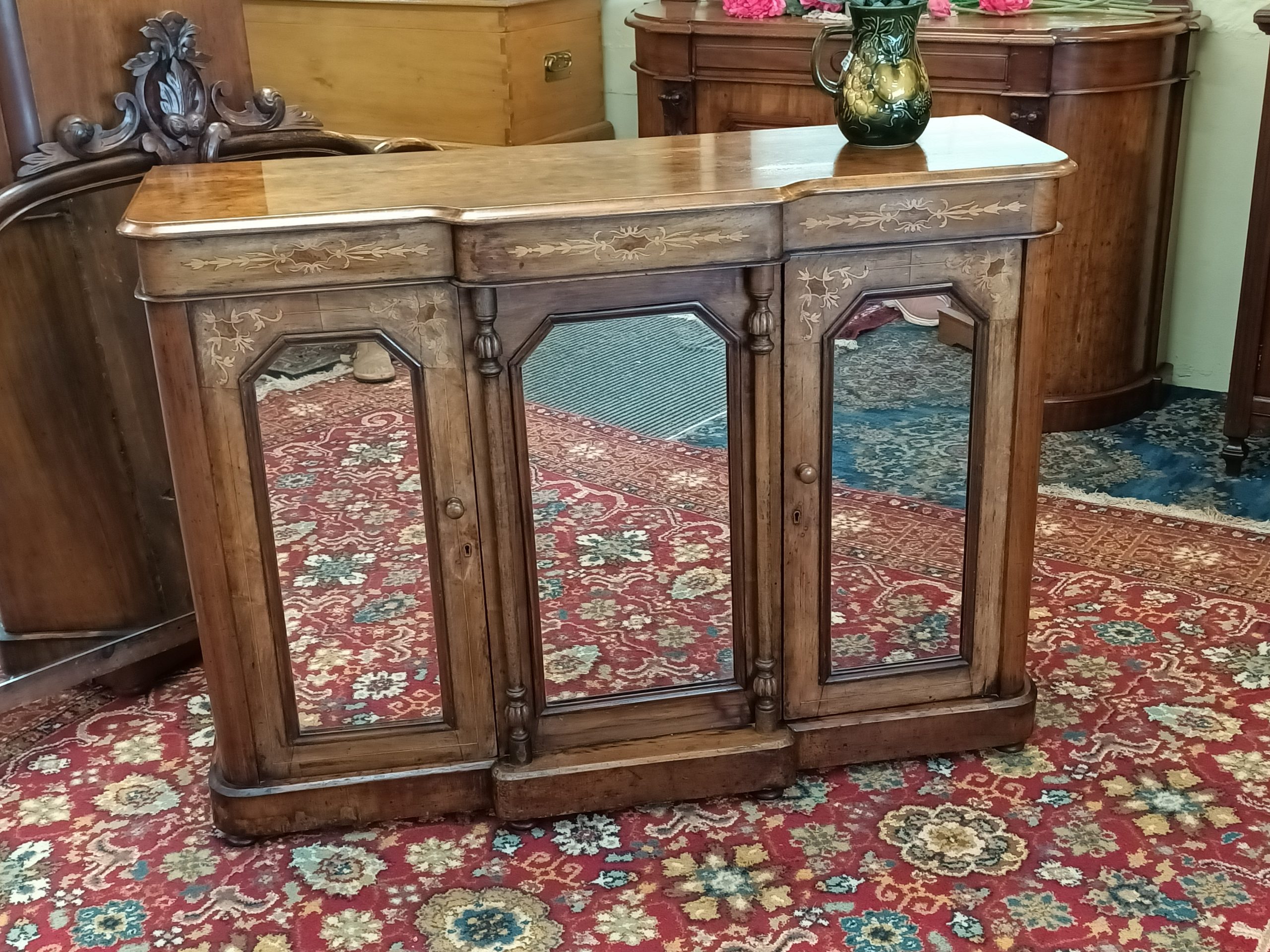We have a stable of beautiful things here; this darling petite, walnut and burr inlaid credenza is certainly a prized ethereal beauty. Fine inlaid garlands, tryptic mirrored doors, tapered columns and plinth on breakfront. With or sans big mirror back, with an auburn hued framed... I love it both ways. Narrow gauge, so happily slots in most places. Excellent condition and kindly faded to hues of coffee cake. Circa 1880.