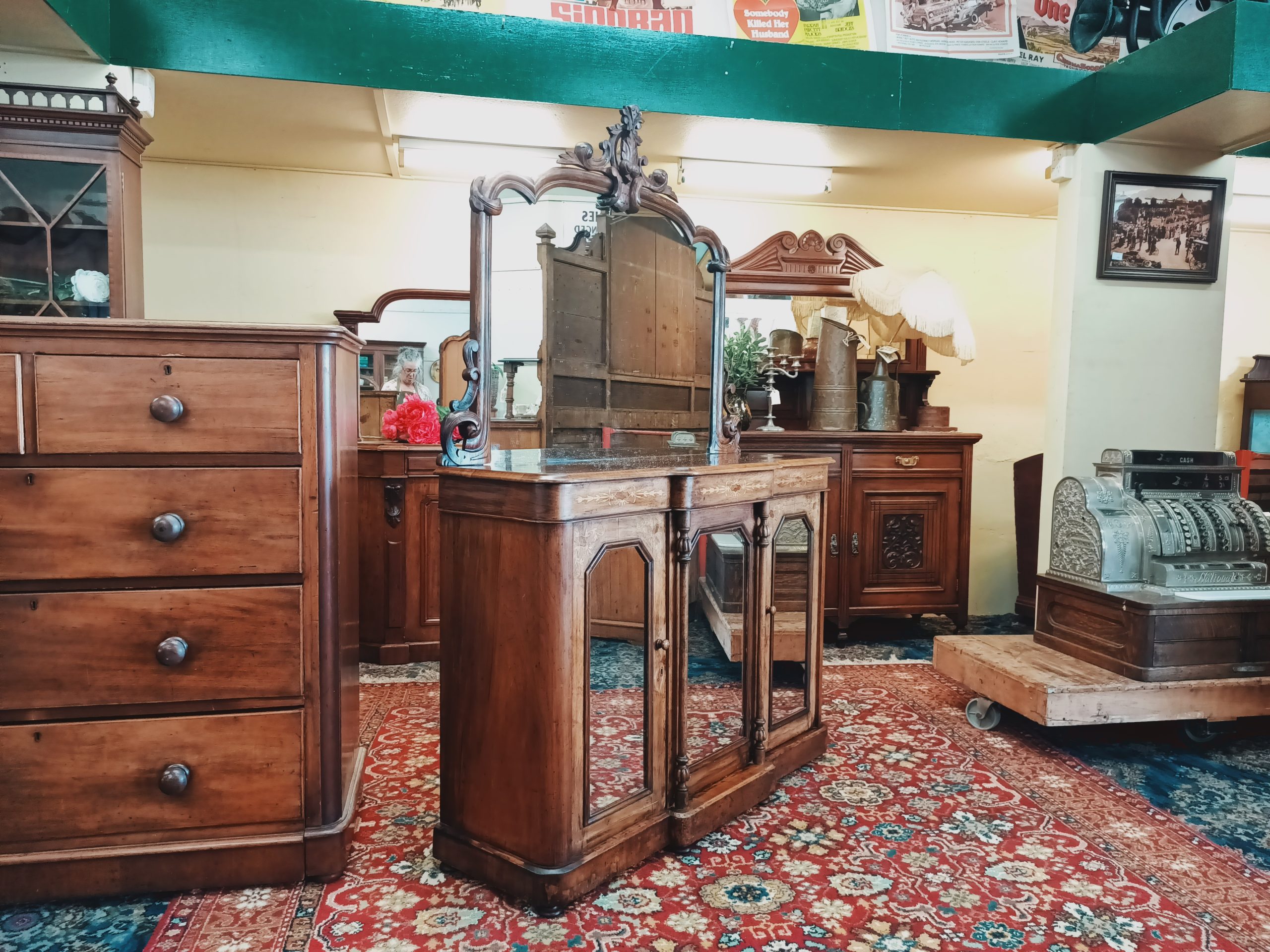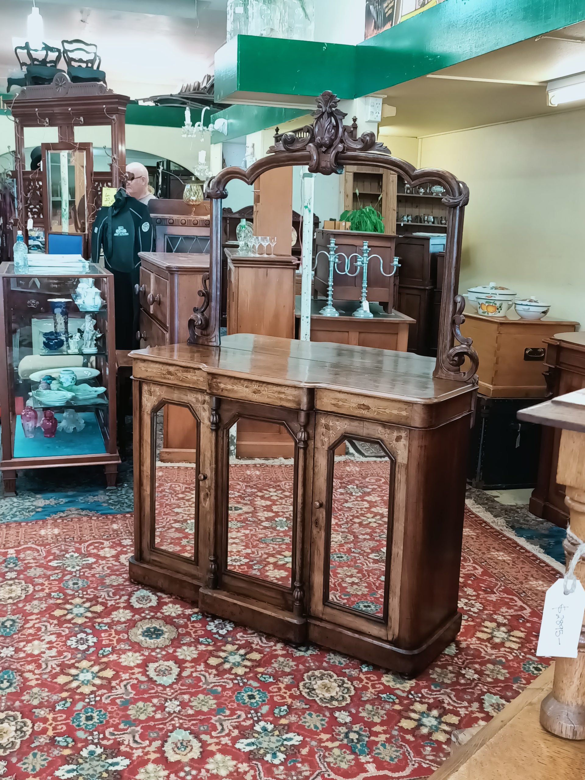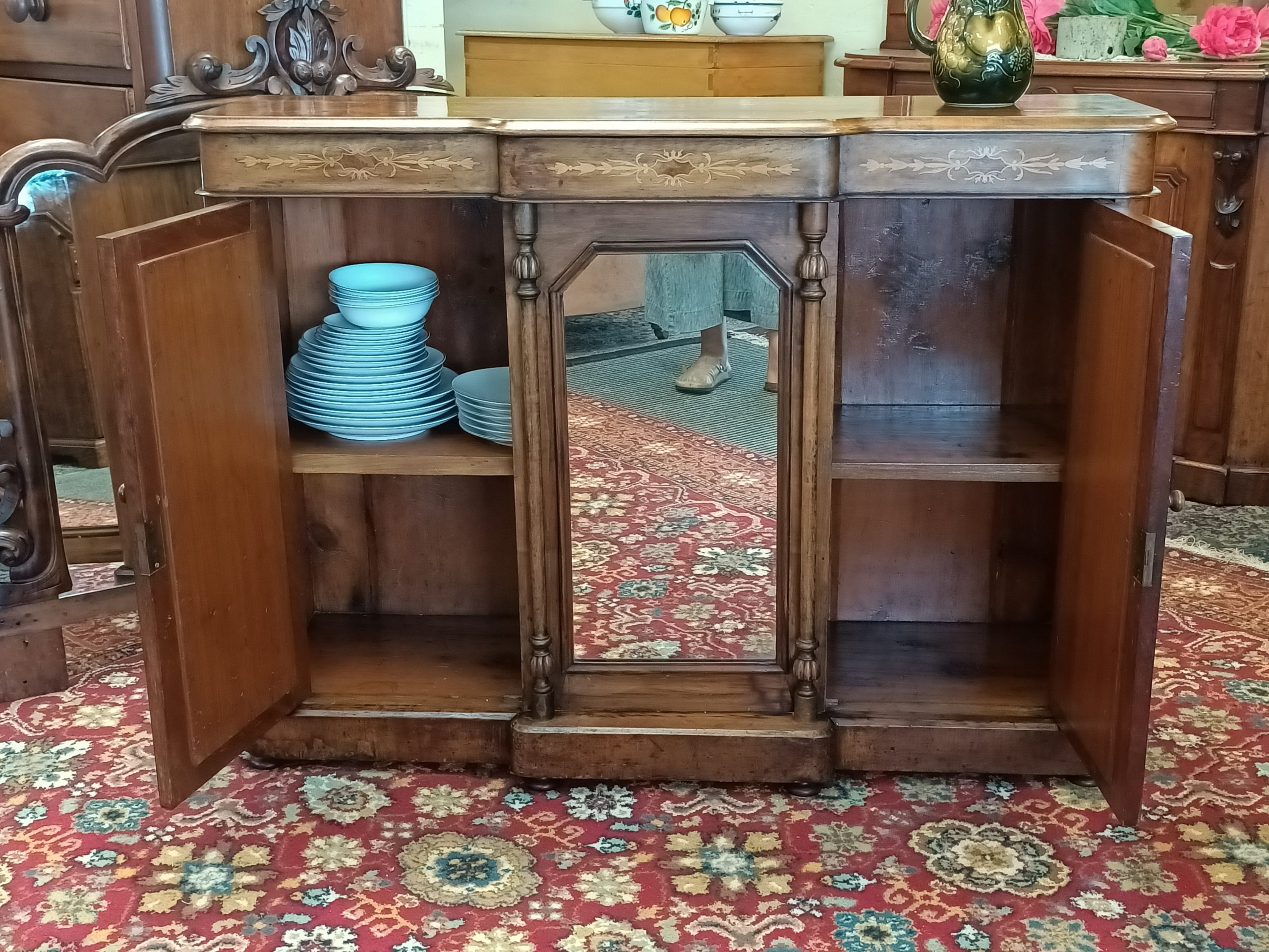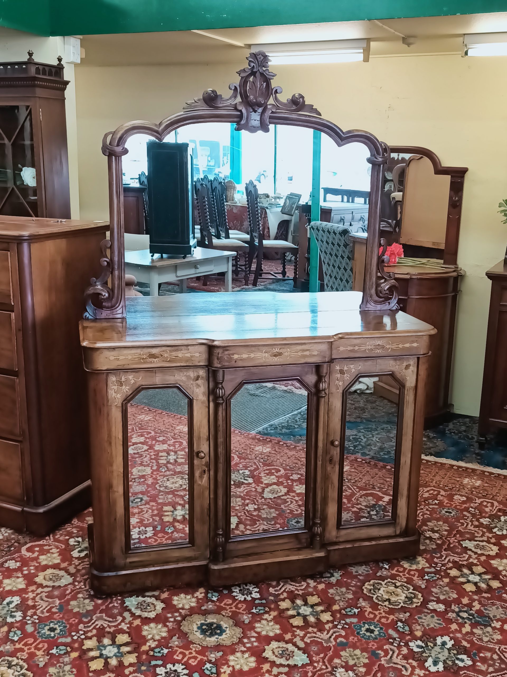 We have a stable of beautiful things here; this darling petite, walnut and burr inlaid credenza is certainly a prized ethereal beauty. Fine inlaid garlands, tryptic mirrored doors, tapered columns and plinth on breakfront. With or sans big mirror back, with an auburn hued framed... I love it both ways. Narrow gauge, so happily slots in most places. Excellent condition and kindly faded to hues of coffee cake. Circa 1880.